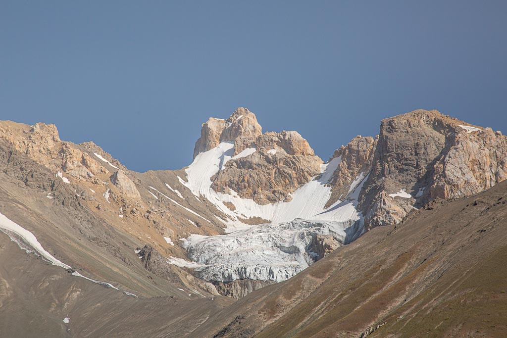 The last section heading up to the pass is really rocky with you having to cross a couple of large lumps that looked like glacial moraines. The trail then makes a slight bend to the west as you pass a glacier on your left before making the final approach to the pass. From the pass at 3,745 meters, we had excellent views of the Peter the I Range as it gnarls around from Gardan i Kaftar, and down onto the rolling plateau ahead of us.