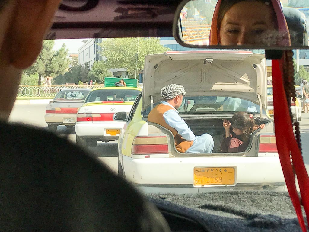 No more room? No problem. Seeing taxis riding around with passengers sitting in open trunks was not uncommon in Afghan cities. If this scene was taking place in the USA (home for me) it would make national news and this man would be cast a villain with angry PTA parents wielding modern day pitchforks in the form of keyboards stopping at nothing, but in Afghanistan this is normal.