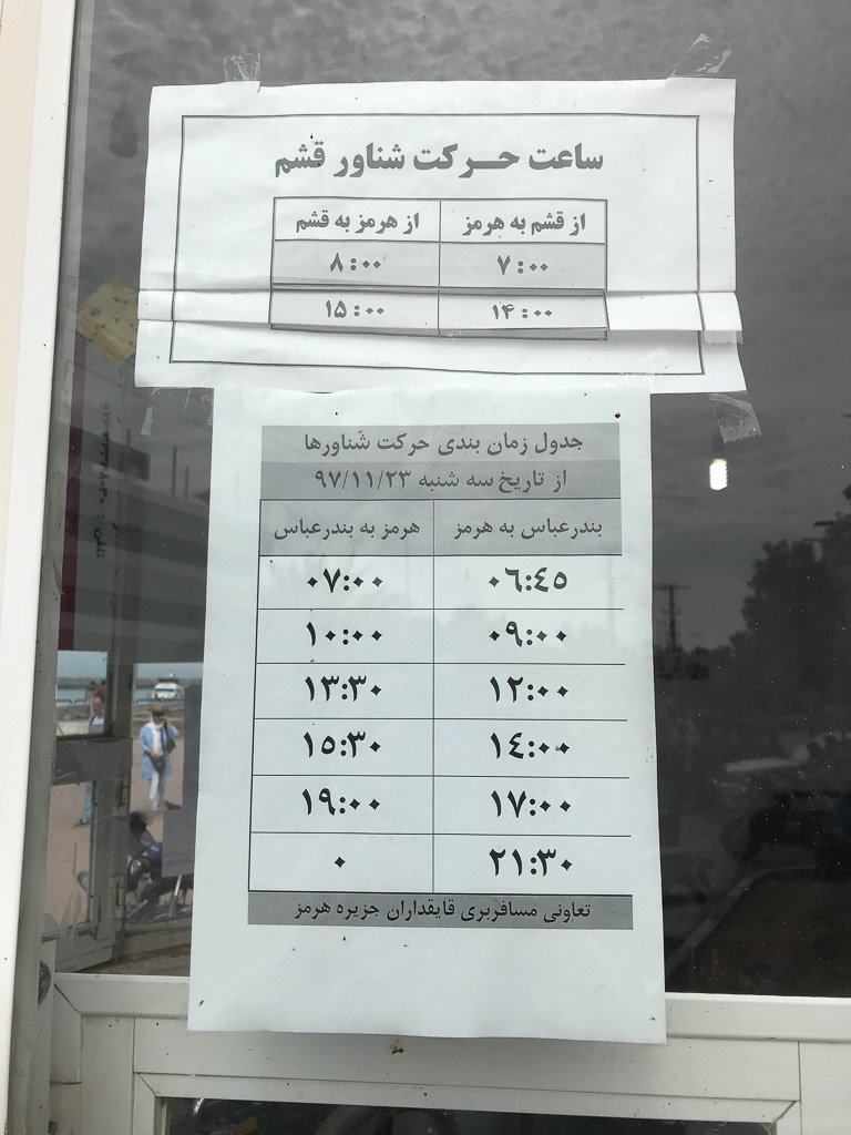 - Ferry departures from Bandar Abbas to Hormuz Island: 6:45 am, 9:00 am, 12:00 pm, 2:00 pm, 5:00 pm, and 9:30 pm.