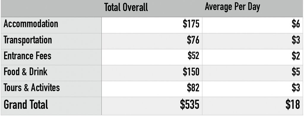 Depending on the type of tour or activity, what you do, if it’s day, overnight, city or private your costs here can range a bit (if you even opt to do any tours at all).